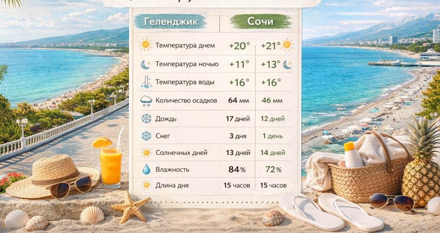По погоде курорты в начале мая довольно близки, но различия всё же есть. Сочи в среднем чуть теплее днём и ночью, зато Геленджик нередко воспринимается легче по общему самочувствию: здесь многим комфортнее гулять, меньше ощущается сырость, а сам климат кажется менее тяжёлым. При этом море и там, и там ещё бодрящее, поэтому полноценный пляжный сценарий всё равно остаётся с оговорками.