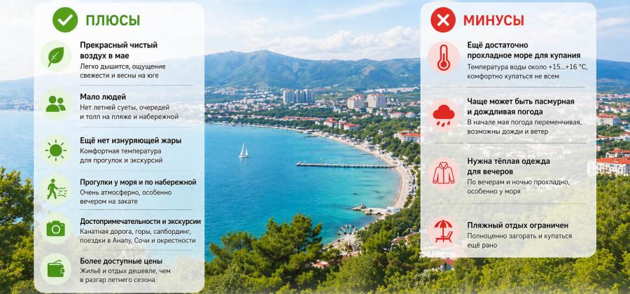 Но и минусы у этого времени тоже есть. Море для нормального купания ещё прохладное, а погода может подвести: пасмурные дни и дожди в начале мая здесь вполне реальны. Так что ехать лучше не с ожиданием полноценного пляжного сезона, а именно за прогулочным отдыхом.